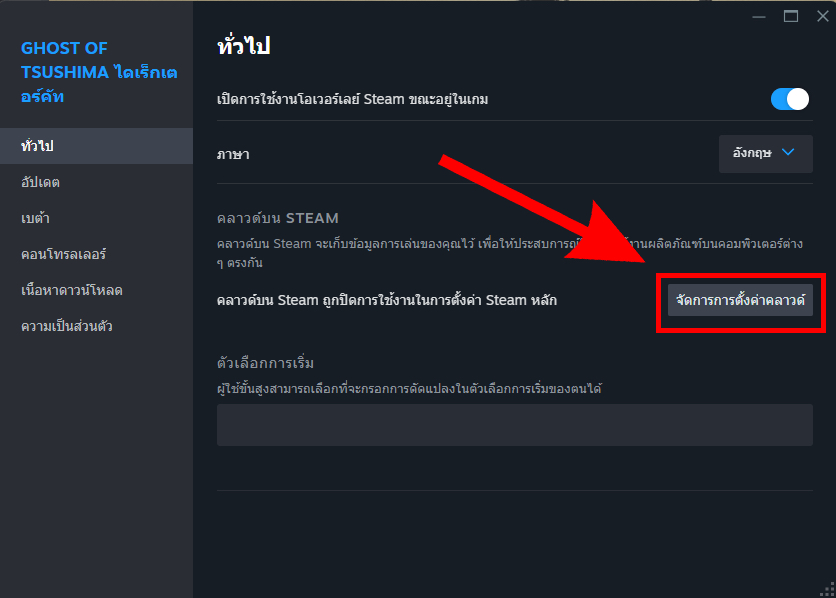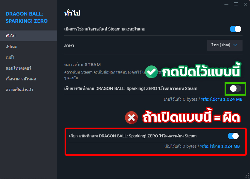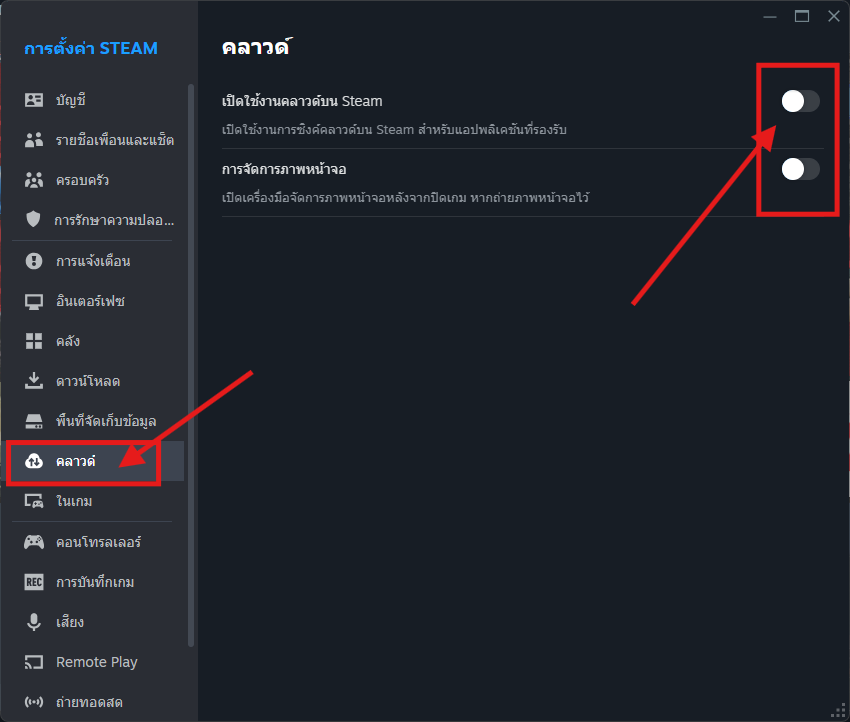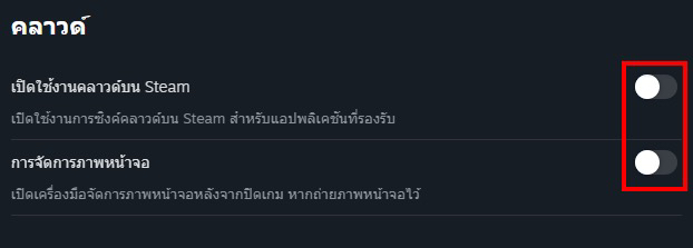 **3.2 ไปตรงการบันทึกเกมไว้บนคลาวด์ Steam แล้วปรับให้เป็นปิดแบบในภาพ หากปิดอยู่แล้วไม่เป็นไร**